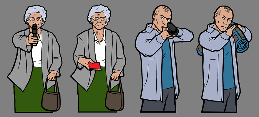One cool aspect of my job on Lethal VR was creating stacks of target characters for the various shooting ranges. We had been building the game exclusively with featureless targets and then decided that if we were truly making an authentic shooting gallery experience we had to get the variety in there. (I think I drew everything in under 48 hours!) A particularly fun part of this task was creating ‘innocent’ versions of the target characters. This meant figuring out how to take a character in a shooting stance and without severely breaking the silhouette giving them a completely innocent version. The office favourite was the thug with the shotgun who also appears innocently carrying a rug over his shoulder.